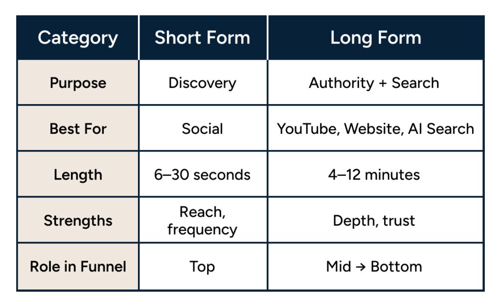 Long-form video builds search visibility, AI discoverability and trust. Use it for ranking in search queries, educating buyers, establishing thought leadership and converting high-intent viewers.
